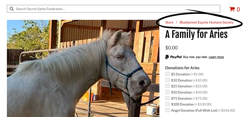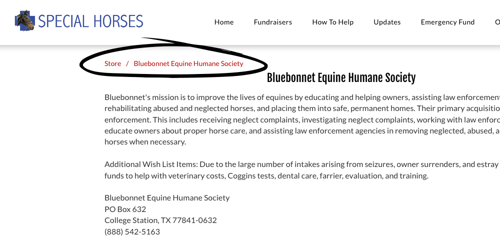 BREADCRUMB MENUS: The breadcrumb menus—easy to see in red!—will allow you to quickly navigate within the fundraiser. When you're on a rescue group's page, look for the red breadcrumb menu located above and to the left of the rescue group's name (see the image on the left, below) If you want to go back to see all five rescue groups, click on "Store." When you are on a horse's page, look for the red breadcrumb menu located above the horse's name. You can click on the rescue group to go back to their page, or click on "Store" to take you back to see all five rescue groups (see the image on the right, below).